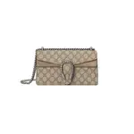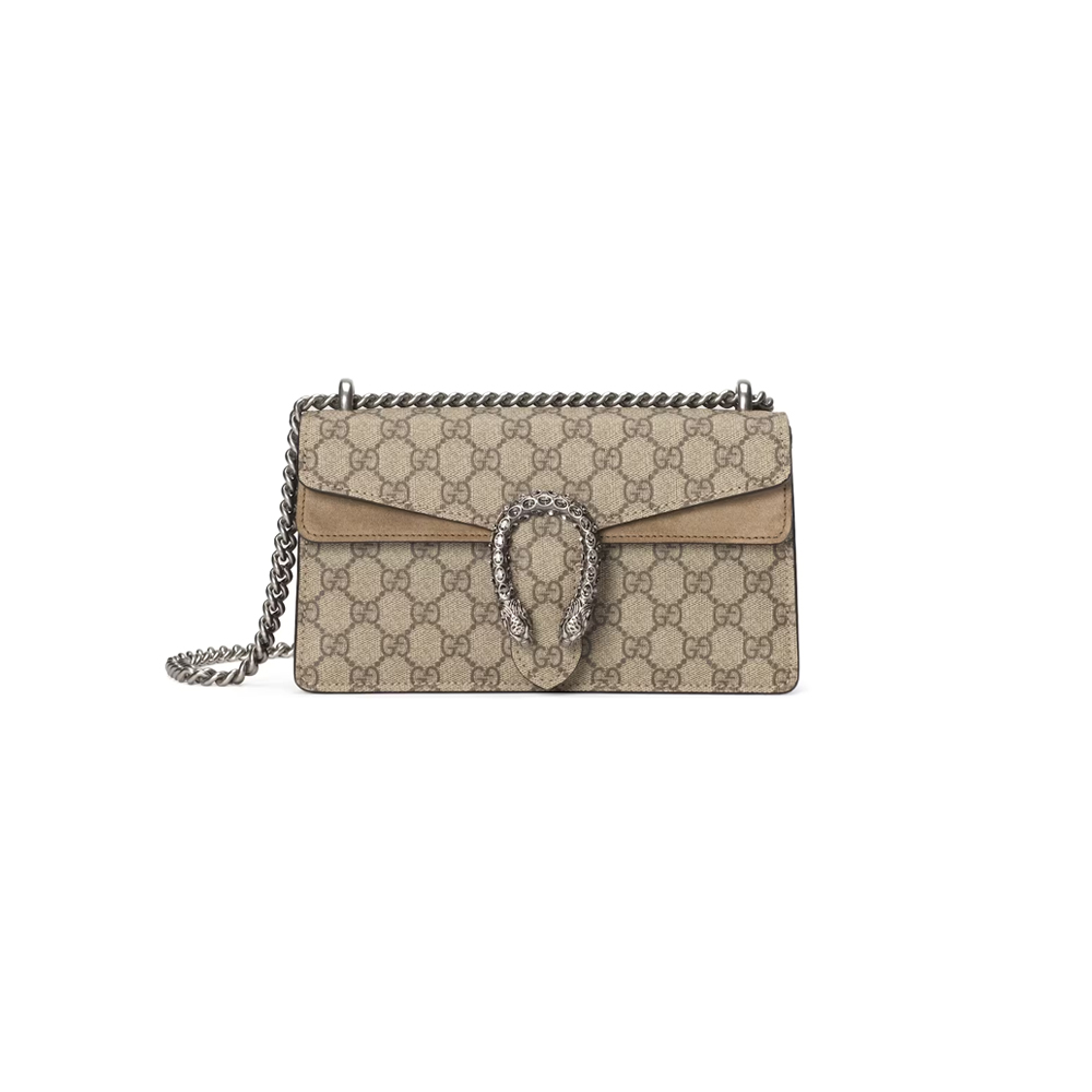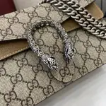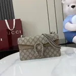 Чантата “Dionysus Medium Shoulder Bag” е съвършено съчетание между класическа естетика и модерна изтънченост. Модната къща представя този модел с характерен монограмен мотив и изящна метална катарама, вдъхновена от митологичен символ – детайл, превърнал се в иконичен елемент на престижната колекция. Финият текстилен материал е комбиниран с елегантни кожени акценти, които подчертават структурата и придават завършен, премиум вид. Верижната презрамка добавя нотка на съвременен блясък и позволява носене както на рамо, така и през тяло. Резултатът е аксесоар с ясно разпознаваем силует и изискано присъствие.