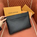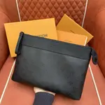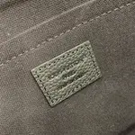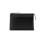 Този елегантен клъч от дизайнерския дом е създаден за мъже с усет към минимализма и изисканите детайли. Изработен от фина естествена кожа с тъмно монограмно релефно покритие, моделът съчетава текстура и дълбочина в стилна монохромна палитра. Горната част е подсилена с гладък кожен кант и завършена с метален цип и удобна кожена каишка за носене на китката. Вътрешността предлага достатъчно пространство за документи, телефон и ключови аксесоари, което го прави идеален както за ежедневие, така и за вечерни излизания.