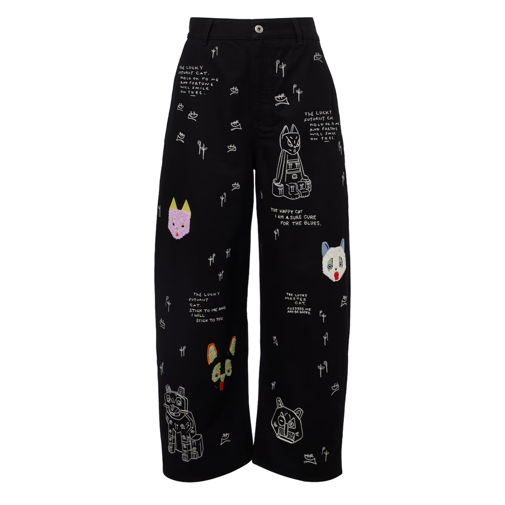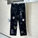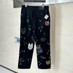 Моделът „Stamp Cotton Trousers“ представя смела интерпретация на модерните градски панталони. Луксозната линия комбинира комфортна памучна материя с артистични графични мотиви, които създават уникална визуална идентичност. Дизайнерският дом използва контрастни илюстрации и текстови елементи, придаващи динамика и индивидуалност на силуета. Свободната кройка осигурява удобство и естествено движение през целия ден. Емблематичният дизайн превръща този модел в отличителен акцент за модерния гардероб.