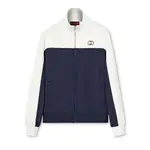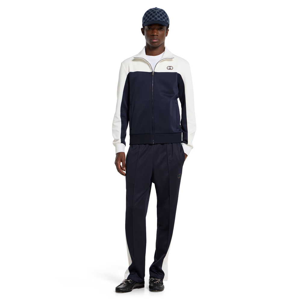 Този комплект от дизайнерската къща съчетава класическия спортен стил от 70-те с модерна елегантност и прецизна изработка. Горната част е леко структурирана с висока яка, цип отпред и минималистично лого, което добавя изискан щрих. Панталоните са със стеснена кройка и еластична талия с връзки за перфектно прилягане. И двете части са изработени от техническо джърси – материя, която осигурява комфорт, мекота и елегантно падащ силует. Контрастните панели в бяло подчертават изчистената линия и придават динамика.