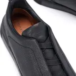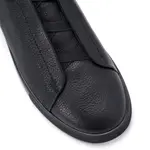 Този слип-он модел от дизайнерската колекция представя минимализма в най-прецизна форма. Изработен изцяло от висококачествена естествена кожа с фина текстура, силуетът е изчистен и съвременен, без връзки – за максимално удобство и визуална лекота. Вътрешната подплата и гъвкавата подметка осигуряват комфорт при продължително носене, докато изчистеният черен цвят придава универсалност и престиж. Перфектен баланс между спортна свобода и градска елегантност.